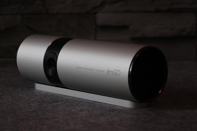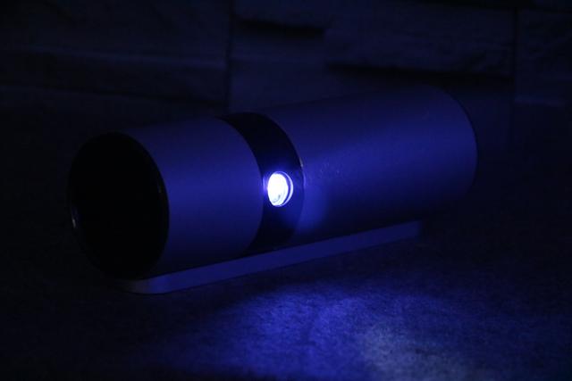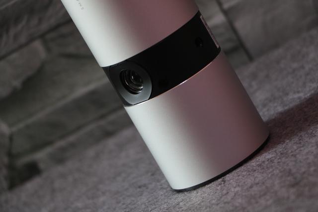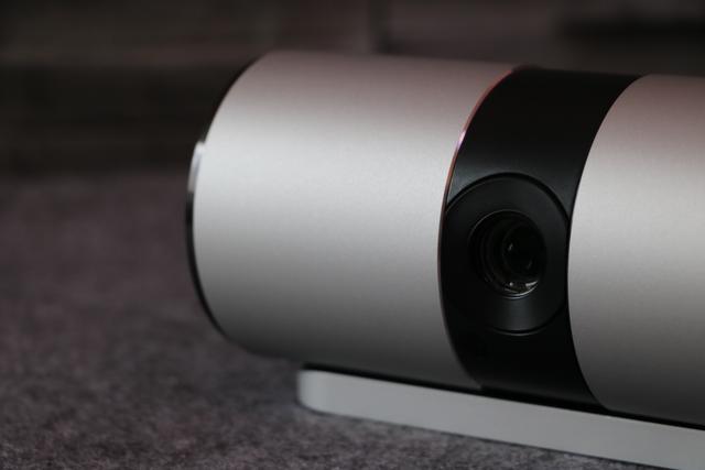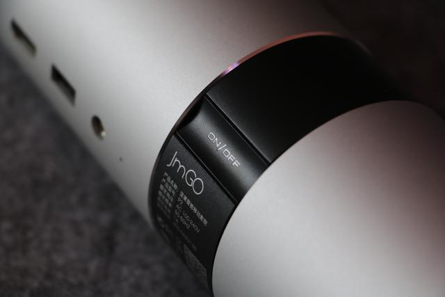 你的正面设计十分的简洁,除了机身右侧出生时候携带的坚果logo胎记外,一颗高透光镀膜镜头则格外的显眼,你搭载的是升级的DMD投影芯片,1280*720高清分辨率,250ANSI流明的投影亮度,使得你不仅能够获得更加细腻的投影效果,同时也能够满足大多数场景的需求。目前你支持最大投影尺寸为180英寸,也许你会认为自己与最大投影尺寸能够达到300英寸的投影相比具有天壤之别,但是我想告诉你作为家庭影院这个尺寸足以满足任何家庭的需要。镜头的左下方凸起的黑色圆钮是红外感应探头,用于接收遥控器发送的各项指令。