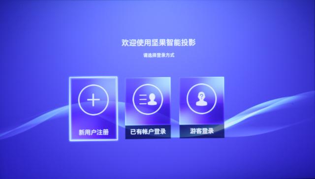 你的是系统是基于Android4.4定制的JmGO OS系统,同时你的整个系统排版跟你二哥相比也发生了翻天覆地的变化。你的开机速度跟你二哥相比有较为明显的速度提升,每次开机后将出现登录方式选项,用户可以通过重新注册帐号、使用已有的帐号或者用游客的身份进行登录。