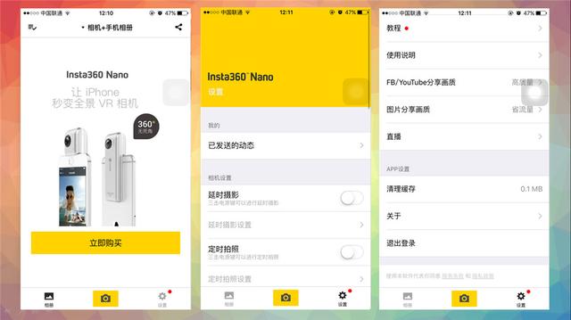 360°全机相机依托于前后两颗摄像头,Insta360 Nano算的上是一款入门级的全景相机,双210°的镜头即可达到360°全景拍摄的效果。