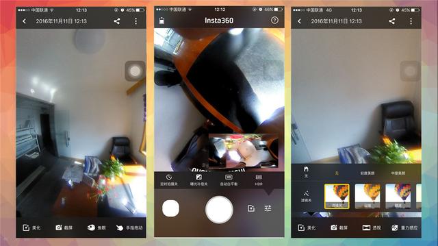 更多拍摄功能这里也是有的,定时拍摄开关、曝光补偿、自动白平衡,还有大家经常喜欢的一种拍摄方式HDR。对于Insta360 Nano全机相机上的水印LOGO也是设计了好几种供用户去选择的。日常通过全机相机拍摄的照片也有单独的相册,在APP主页面的右侧即可进行观赏,你会发现都是缩略的全景图,当然这样的照片点击欣赏进行滑动即可看出全景效果的魅力所在。