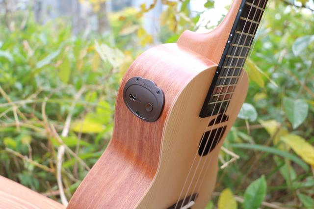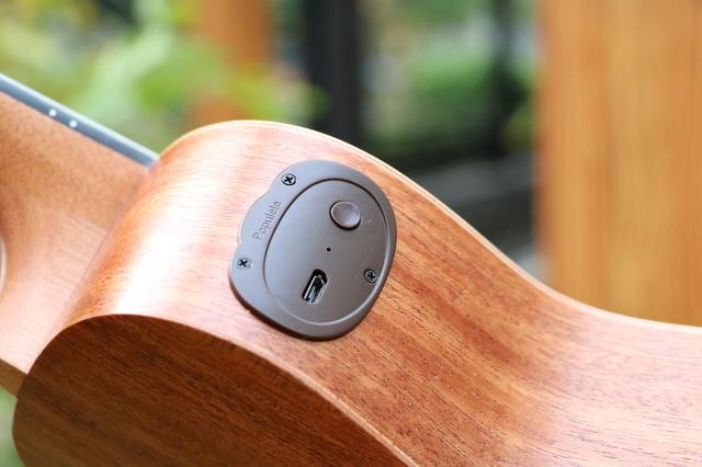 Populele智能尤克里里-咪蒙的侧面有一个猫耳朵造型的面板,面板上依次USB充电接口、工作指示灯以及开机按钮,长按2-3秒开机,长时间不使用Populele智能尤克里里-咪蒙会自动关机。咪蒙内置了800mAh锂电池,充满电大概需要2.5小时左右,最长可以续航10小时。