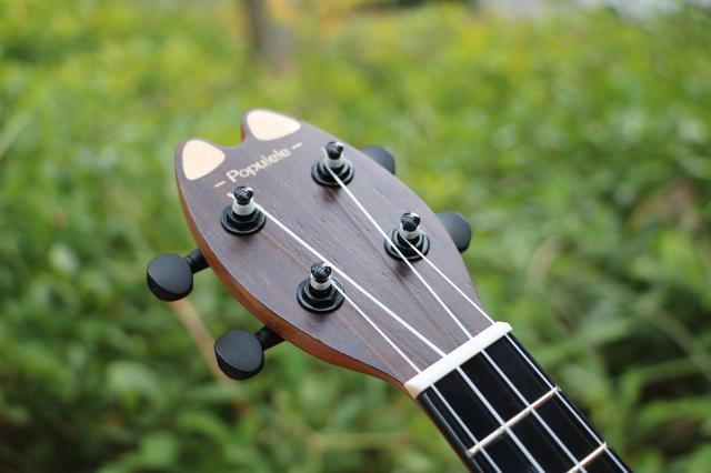 Populele智能尤克里里-咪蒙的琴头是最具特色的地方,猫耳朵的造型非常可爱呆萌。四颗炫柱从琴头底部贯穿而出,均匀的分布在琴头, 咪蒙采用了全金属18铜齿封闭式旋钮,曲面旋钮符合人体工学设计,实际调弦感觉十分的轻松方便。